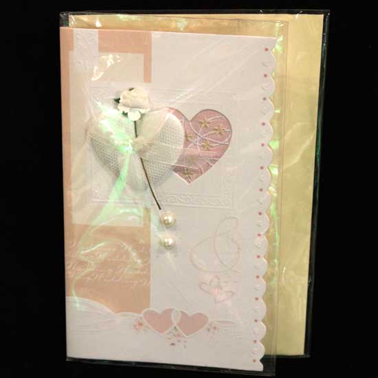 This beautiful card is characterized by heart-shaped decorations. With a white artificial rose placing on the crafted heart, the card looks more graceful. Send this sweet card to your sweetheart to show your love.
