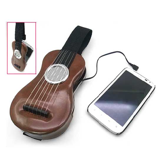 This speaker pouch features a guitar shape for a touch of uniqueness. It fits for the iPhone 5 and other same sized mobile phones. This battery-operated speaker pouch is completed with a strap on the top for easy carrying.