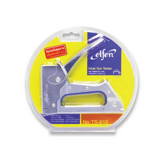 Showcased is a heavy-duty gun tacker. It features a high-quality metal construction with polished finish. This gun tacker is suitable for stapling thick papers and documents.