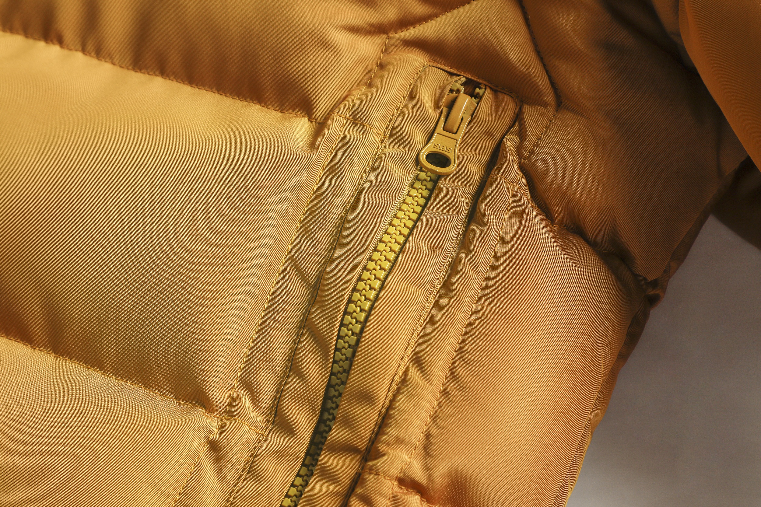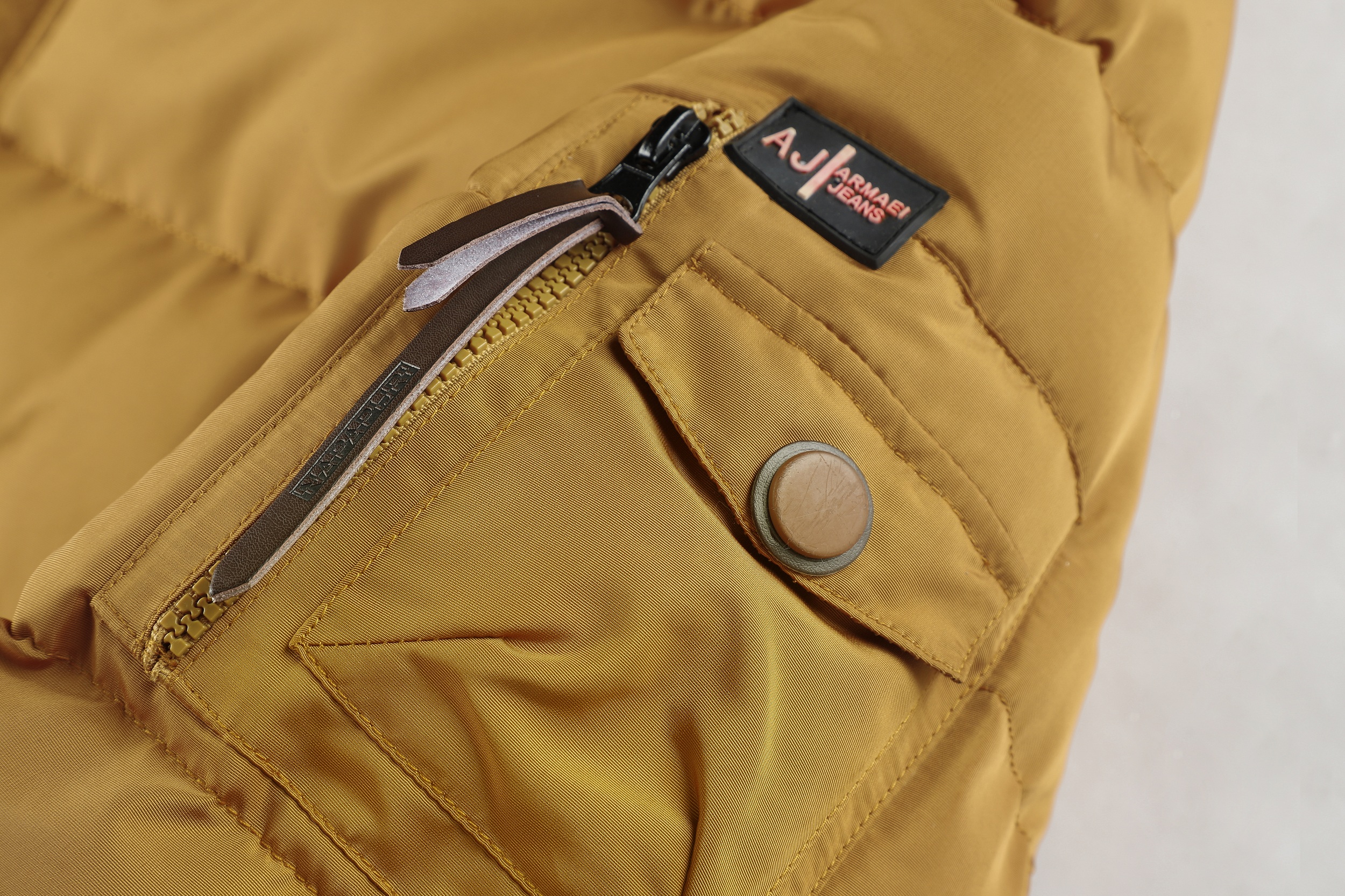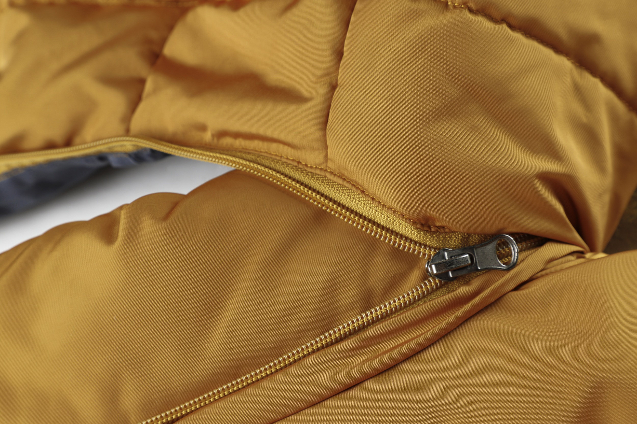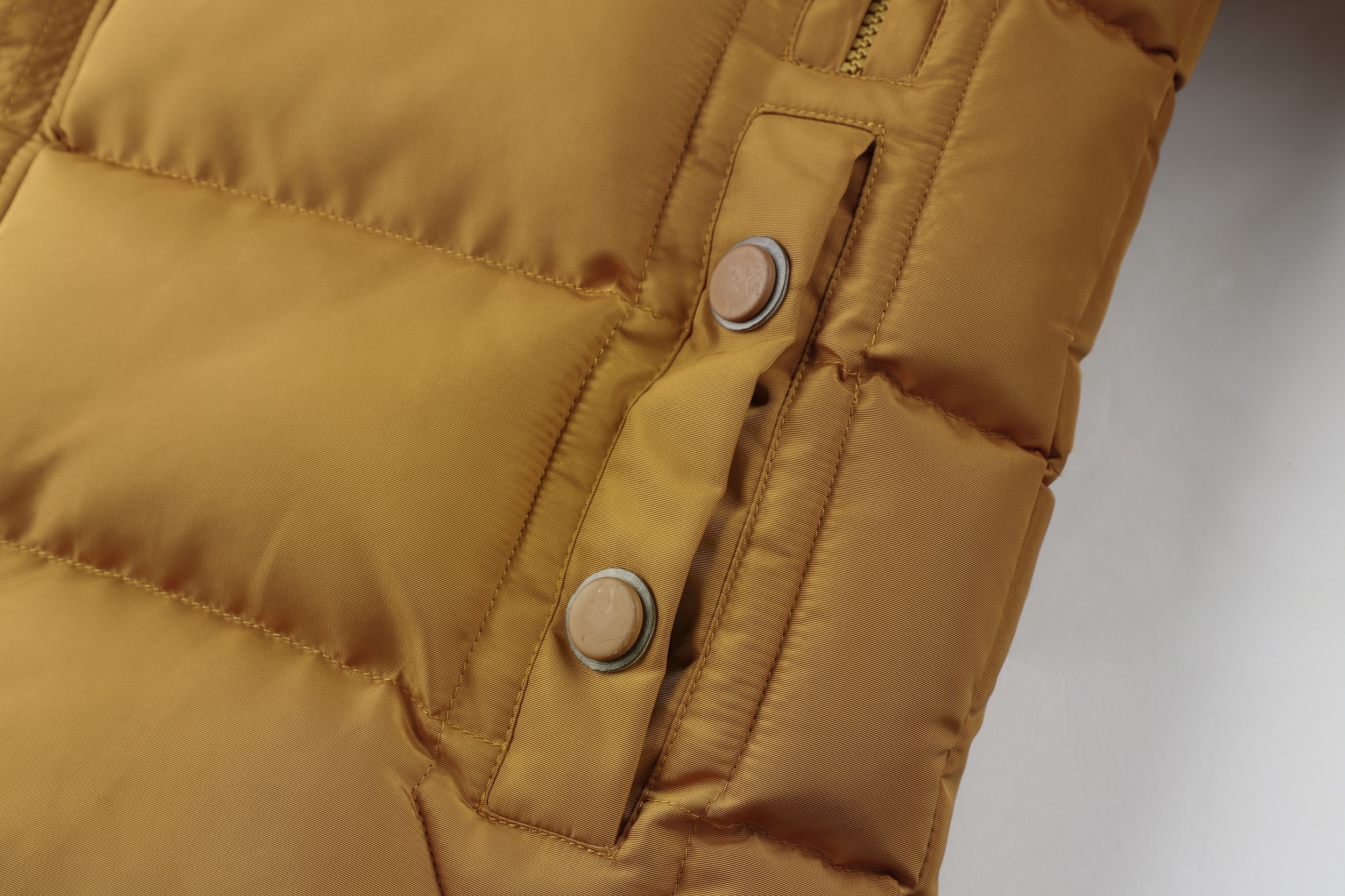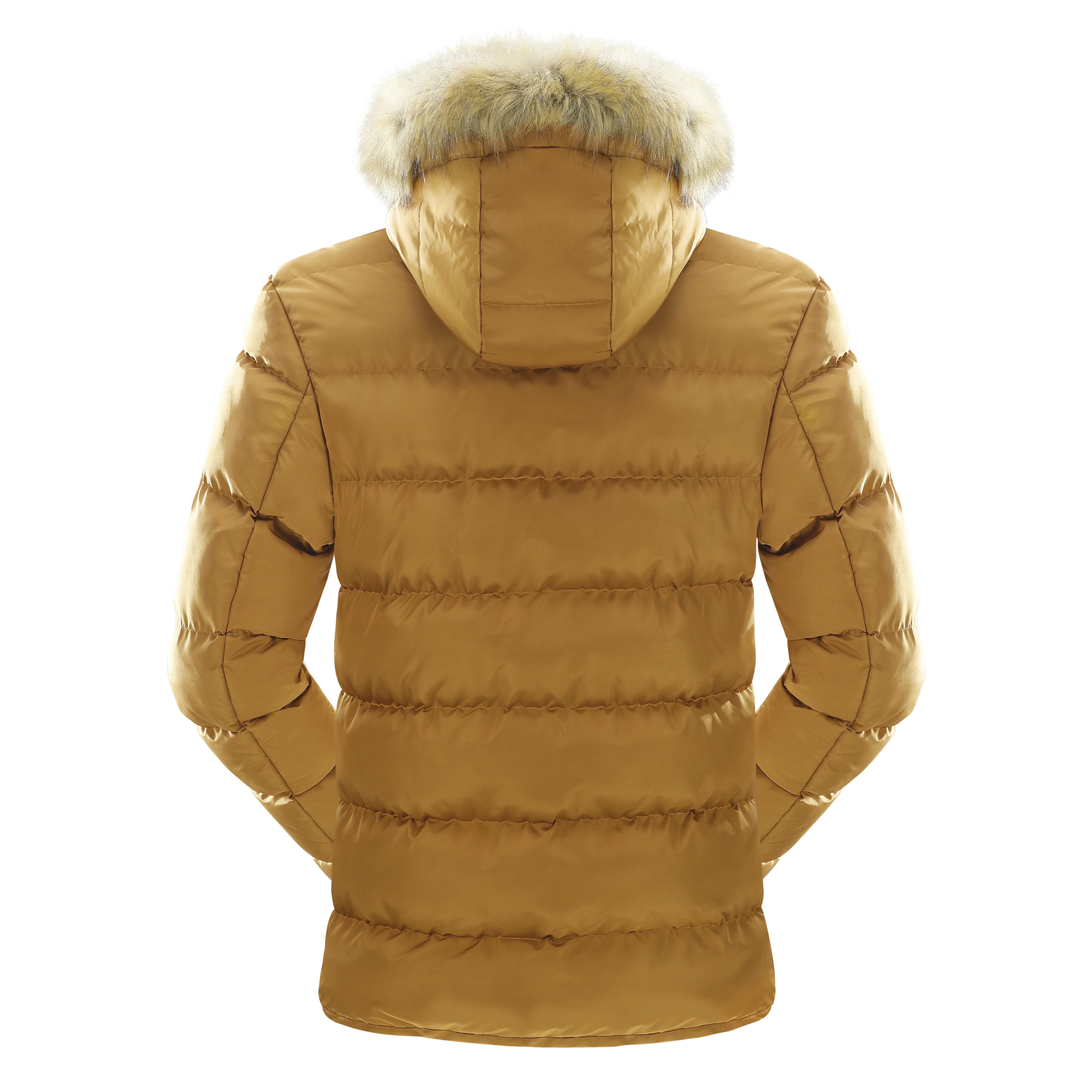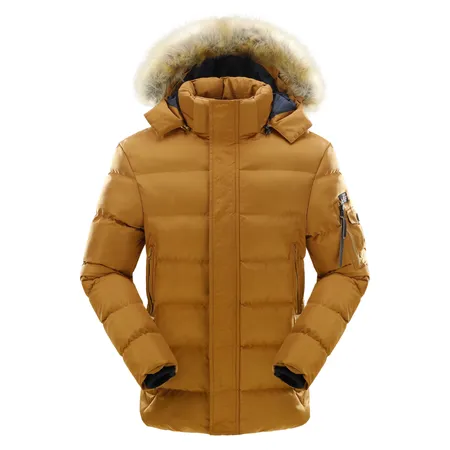 The image displays a digital interface showcasing a mustard yellow winter jacket. This jacket features a fur-lined hood, providing additional warmth and style. The design includes a high collar and long sleeves, suitable for cold weather conditions. The interface is user-friendly, offering navigation options such as "AI search," "Web search," "Translate," and "Copy." Below the main image, there are smaller thumbnails that likely offer different views or related products, enhancing the user's ability to explore details. The background of the interface is clean and white, which highlights the product effectively. The overall layout is designed for easy browsing and selection, making it convenient for users to make informed choices about their purchases.