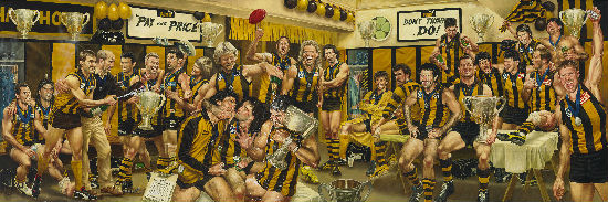 In 2011 the highly successful AFL football club Hawthorn, selected their greatest composite team from their 10 winning premiership years. This spanned almost 50 years of the clubs history from 1961 to 2008. Cooper was commissioned to bring the greatest players from the different eras back to life, together into one moment in time. This image depicts the Club’s greatest Premiership team, selected by their fans on the Club’s website poll. A painting for the people, chosen by the people.