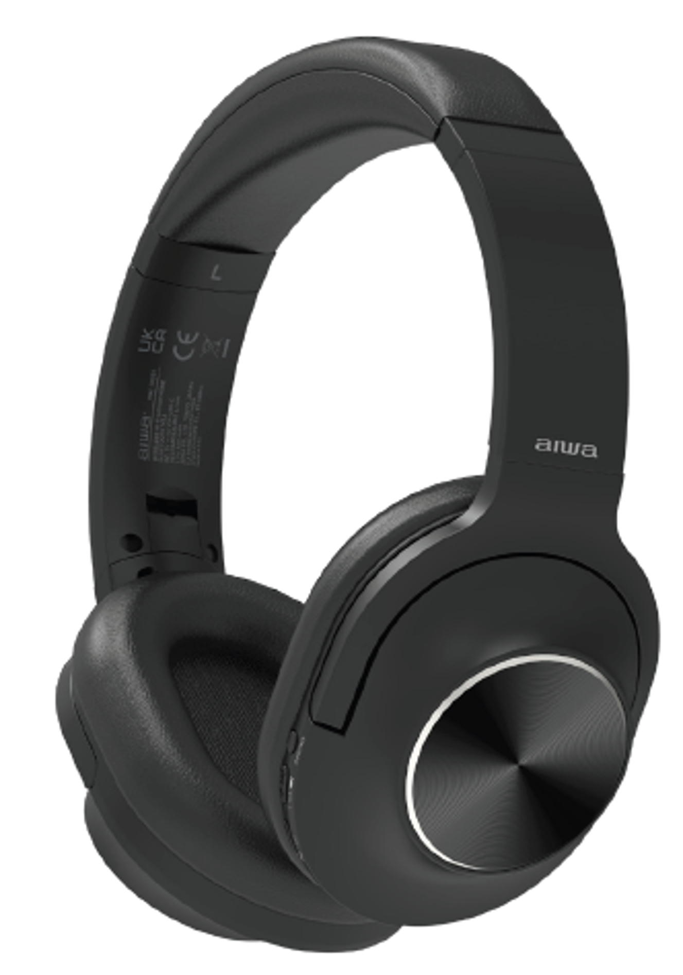 Bluetooth 5.4 wireless headphones with metal panels, aux-in jack, micro-SD MP3 player, and PU leatherette ear pads. Features USB-C charging, a 300mAh battery, and 12 hours of use with 2 hours of charging time.