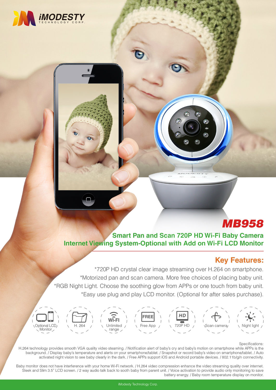H.264 technology provides smooth video steaming.Notification alert of baby's cry on smartphone while APPs is in the background.Display baby's temperature and alerts on your smartphone/tablet. Snapshot or record baby's video on smartphone/tablet.Auto activated night vision to see baby clearly in the dark. Free APPs support iOS and Android portable devices.802.11b/g/n connectivity.