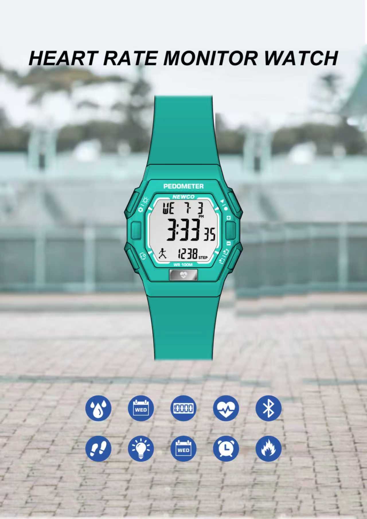 7. Function: Heart rate monitor, Step tracking, calorie burn, mileage, alarm clock.