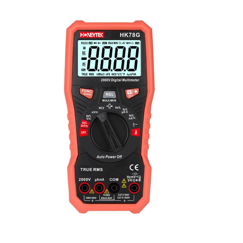 The Honeytek HK78G is a high-performance True RMS digital multimeter built for versatile electrical measurement in industrial, commercial, and field service environments. With a 5999-count display and support for AC/DC voltage measurement up to 2000V, it provides the flexibility needed for advanced electrical diagnostics and general-purpose testing.
