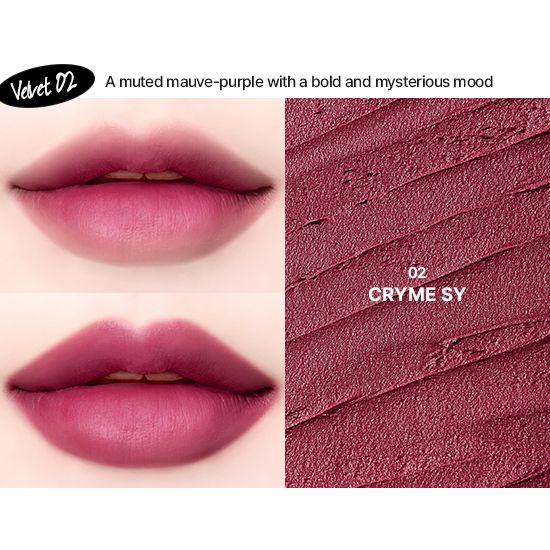 02 CRIME SY is a muted mauve-purple shade with a bold yet sophisticated mood, adding depth and elegance to any makeup look.