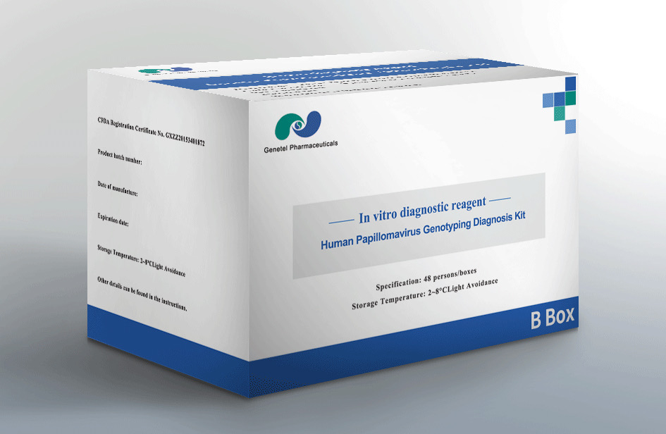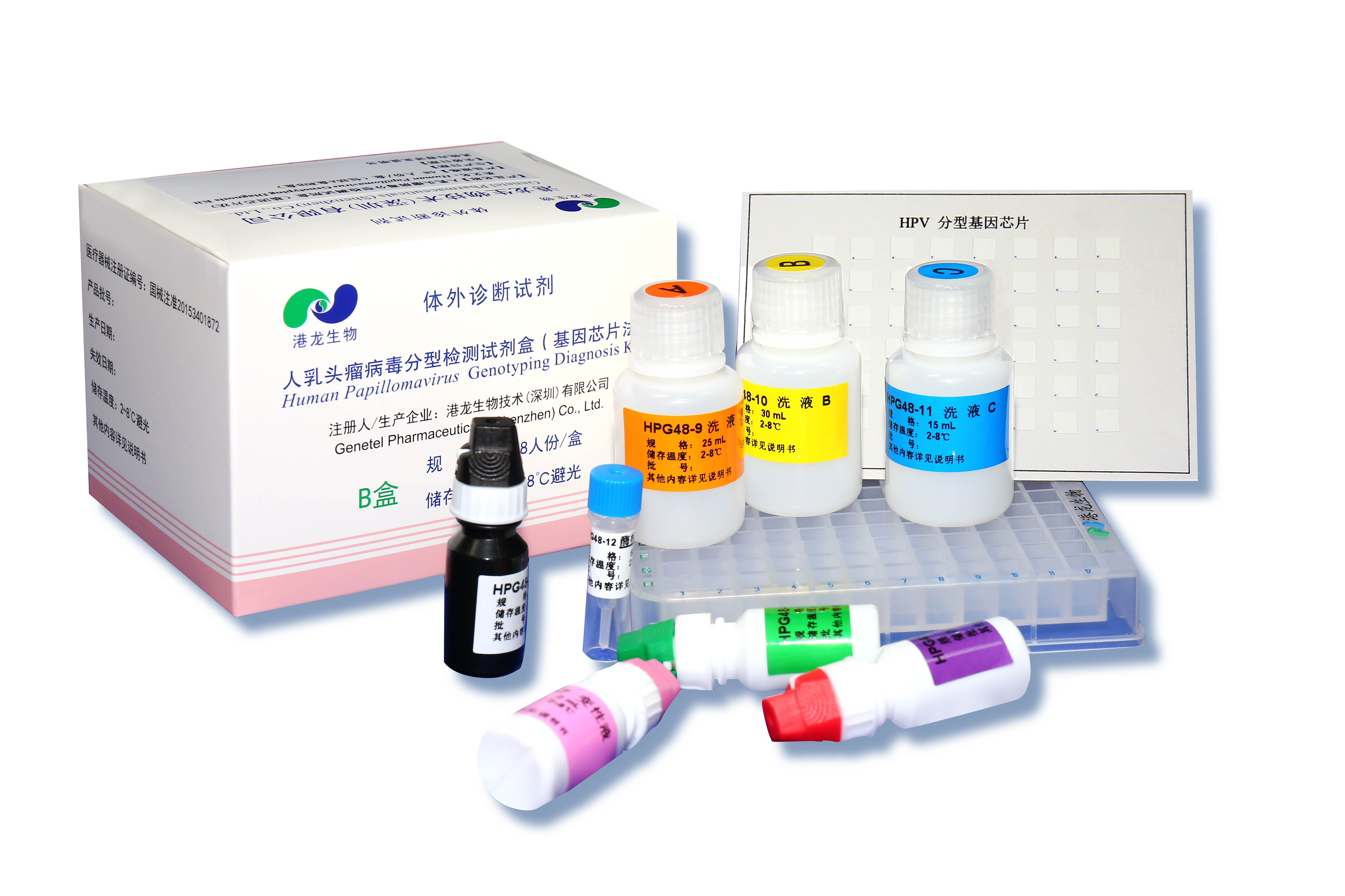 The diagnosis kit based on the DNA microarray technology to identify 26 Human Papilloma Virus genotypes within 5 hours in parallel within one PCR and one hybridization process. The image can be scanned and analyzed by the HPV genotyping detection system. A crucial prevention for cervical carcinoma screening.