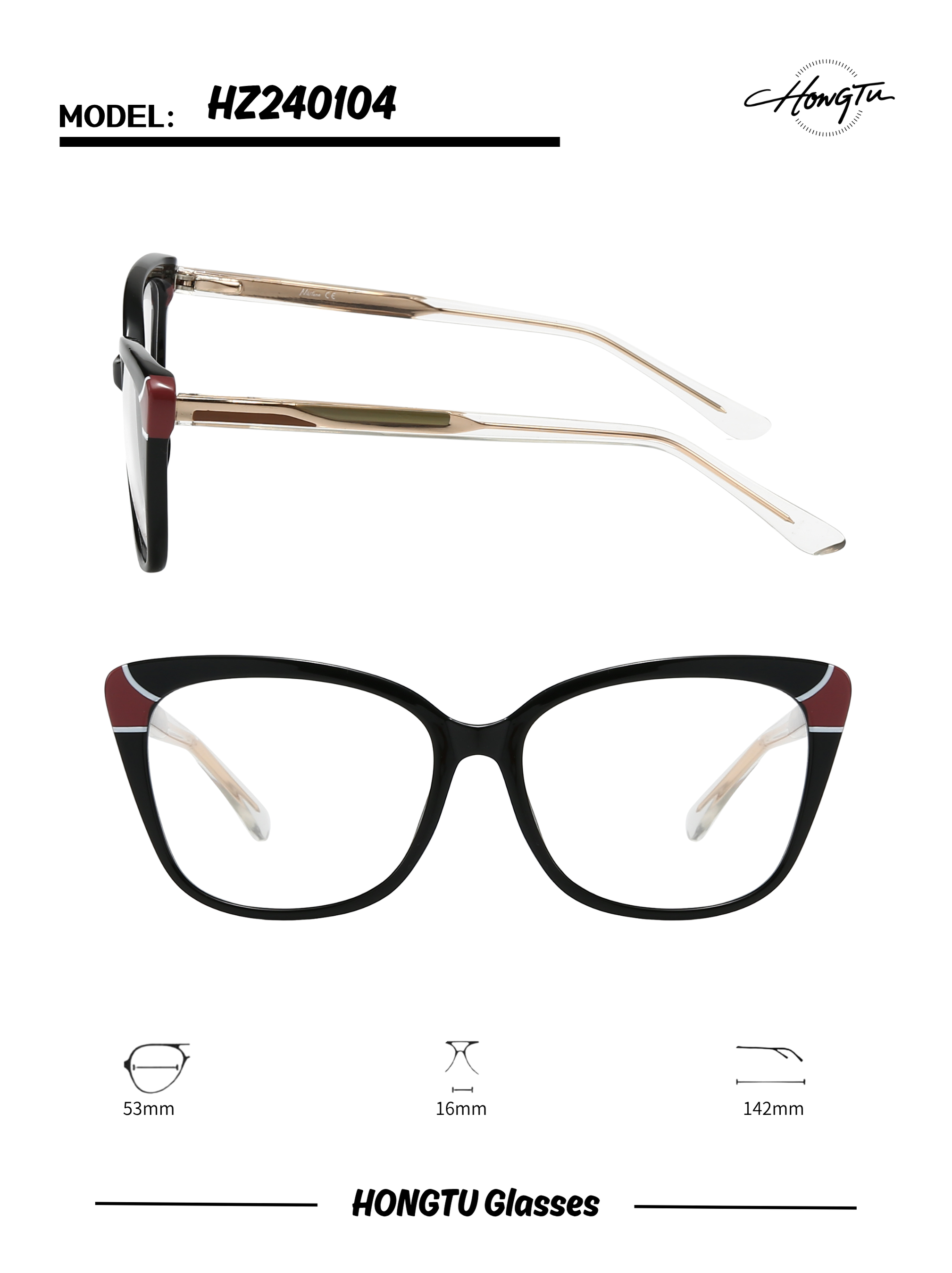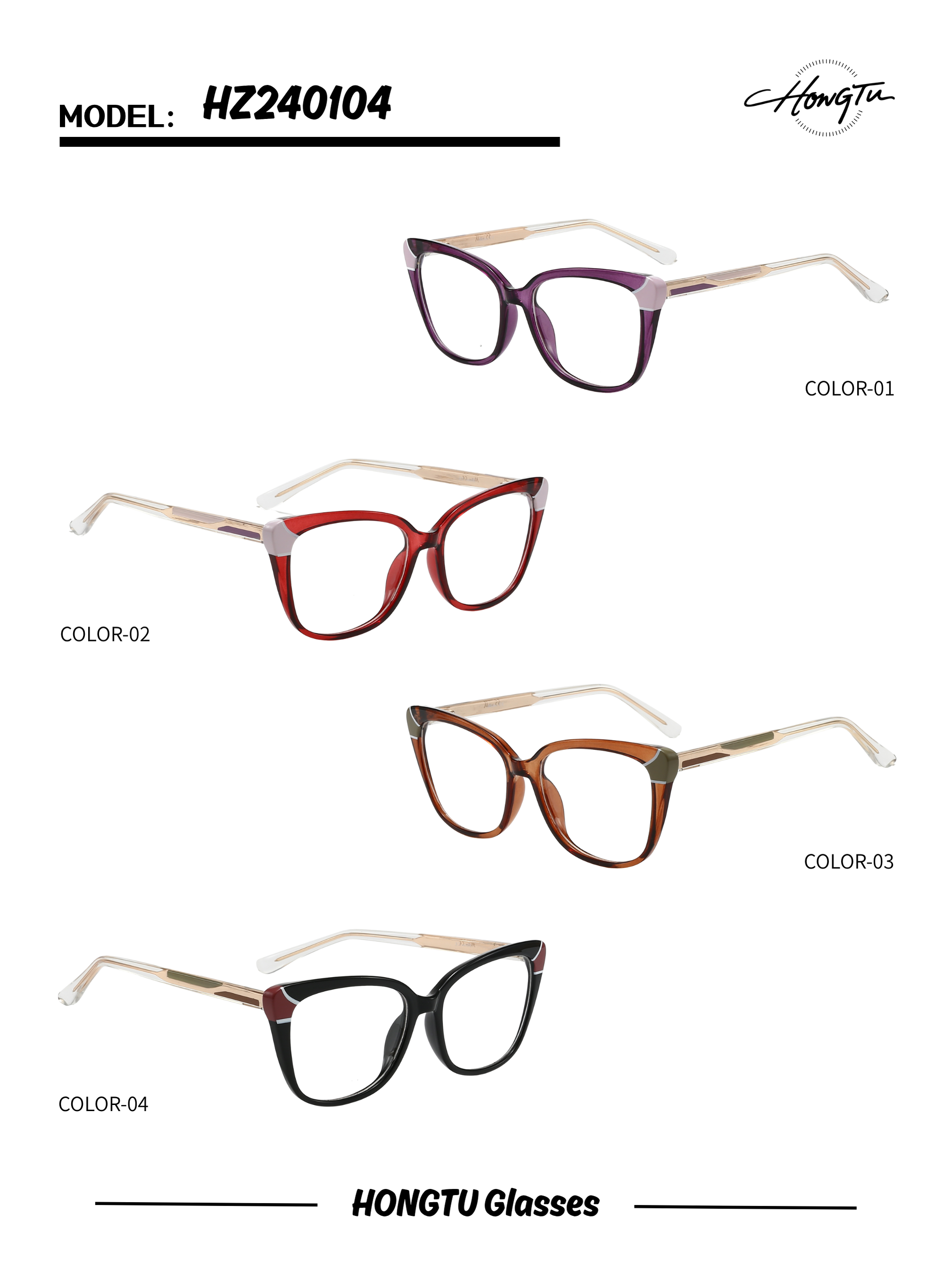 HONGTU Glasses Model HZ240104 features a chic cat - eye frame design with elegant metal detailing and distinctive color accents, available in four distinct color variants (COLOR-01 to COLOR-04). It has a frame width of 53mm, a bridge width of 16mm, and a temple length of 142mm, ensuring a comfortable and stylish fit. Combining trendy aesthetics and meticulous craftsmanship, this model is an ideal choice for those seeking to add a touch of sophistication and individuality to their look.
