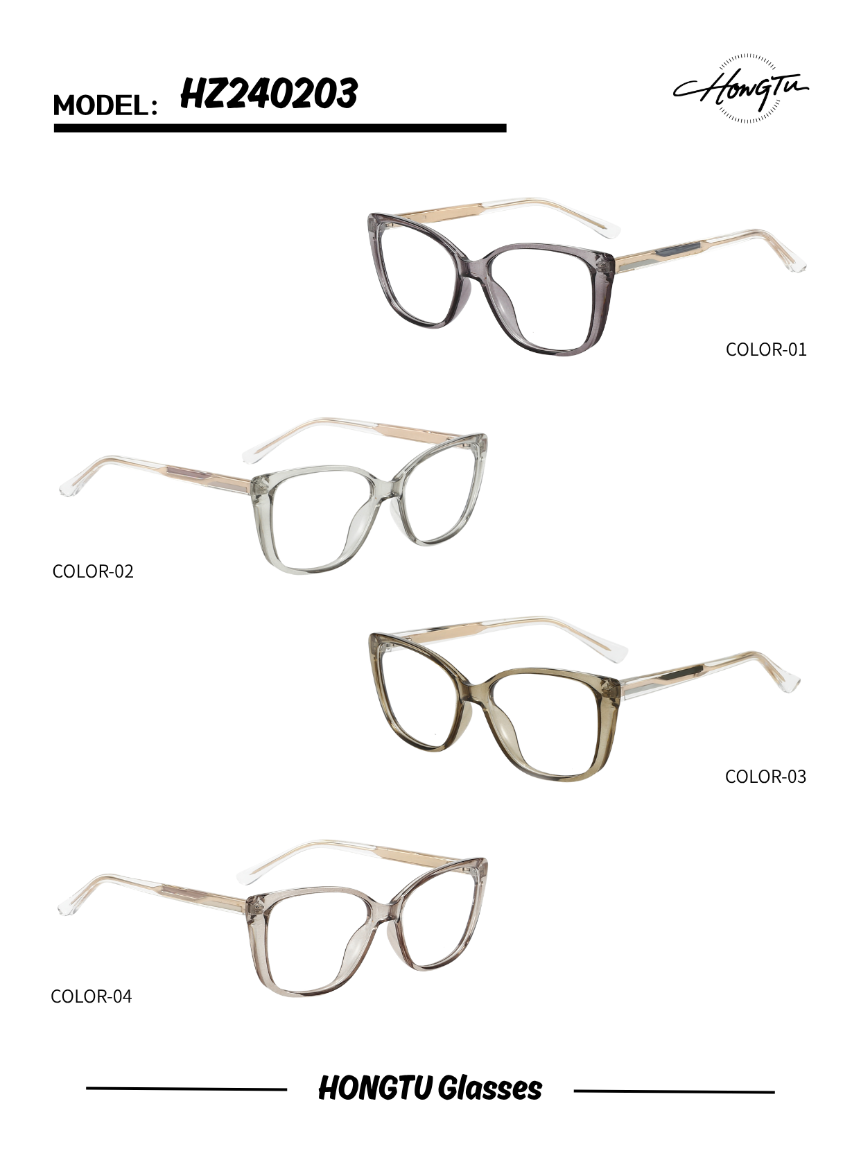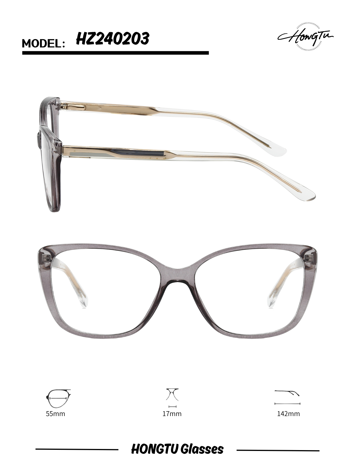 The HONGTU Glasses Model HZ240203 combines contemporary style with exceptional comfort. This model is offered in four distinct color variants (COLOR-01 to COLOR-04), catering to diverse style preferences. Featuring a frame width of 55mm, bridge width of 17mm, and temple length of 142mm, it provides a balanced and comfortable fit for extended wear. With its sleek design and meticulous attention to detail, these glasses are an excellent choice for fashion-conscious individuals seeking versatile eyewear that effortlessly blends modern aesthetics with everyday functionality.