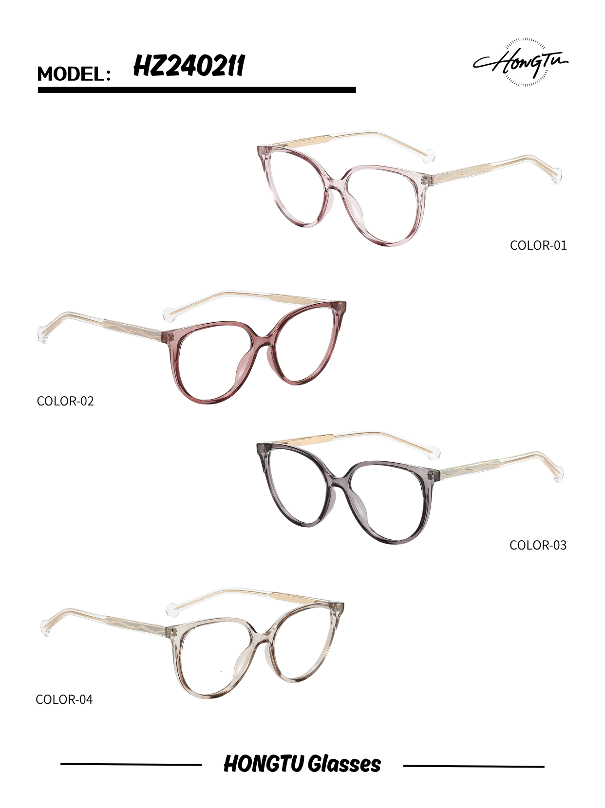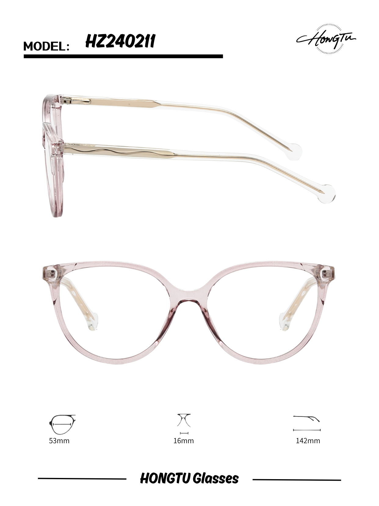 The HONGTU Glasses Model HZ240211 stands out with its delicate proportions and modern appeal. Available in four stylish color variants (COLOR-01 to COLOR-04), it suits both classic and contemporary looks. Featuring a 53mm frame width, 16mm bridge, and 142mm temple length, it offers a precise and comfortable fit. Meticulously crafted for fashion-forward wearers, these glasses merge subtle detailing with all-day comfort.