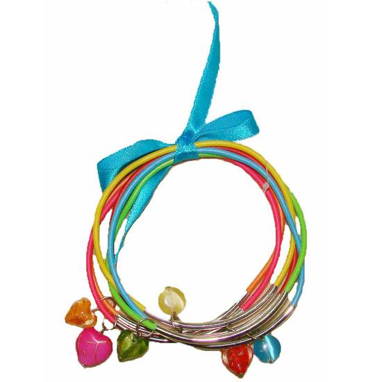 This is a set of hair bands for girls and ladies. There are six strips of bands tied with a blue ribbon. The bands are attached with plastic stones in heart and other shapes.