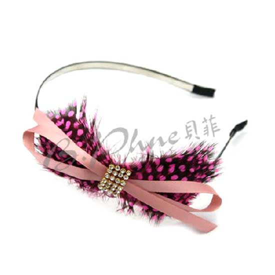 This is a gorgeous hair band featuring pink-and-black feather ornaments for a sense of uniqueness. The pink-hued ribbon bow is accented with shimmering beads. This hair band will surely add extra glamor to your hairstyle and outfit.