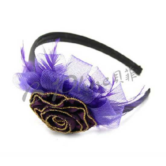 This is an elegant hair band that can be used as a hair ornament to decorate your hairstyle. This hair band showcases a black-toned flower with golden-colored trimming details. The purple mesh fabric creates a striking and gorgeous effect.
