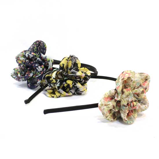 Featured are hair bands decorated with a big, eye-catching flower on each. The flowers are tied in colorful printed fabric. The thin band hides in your hair perfectly.