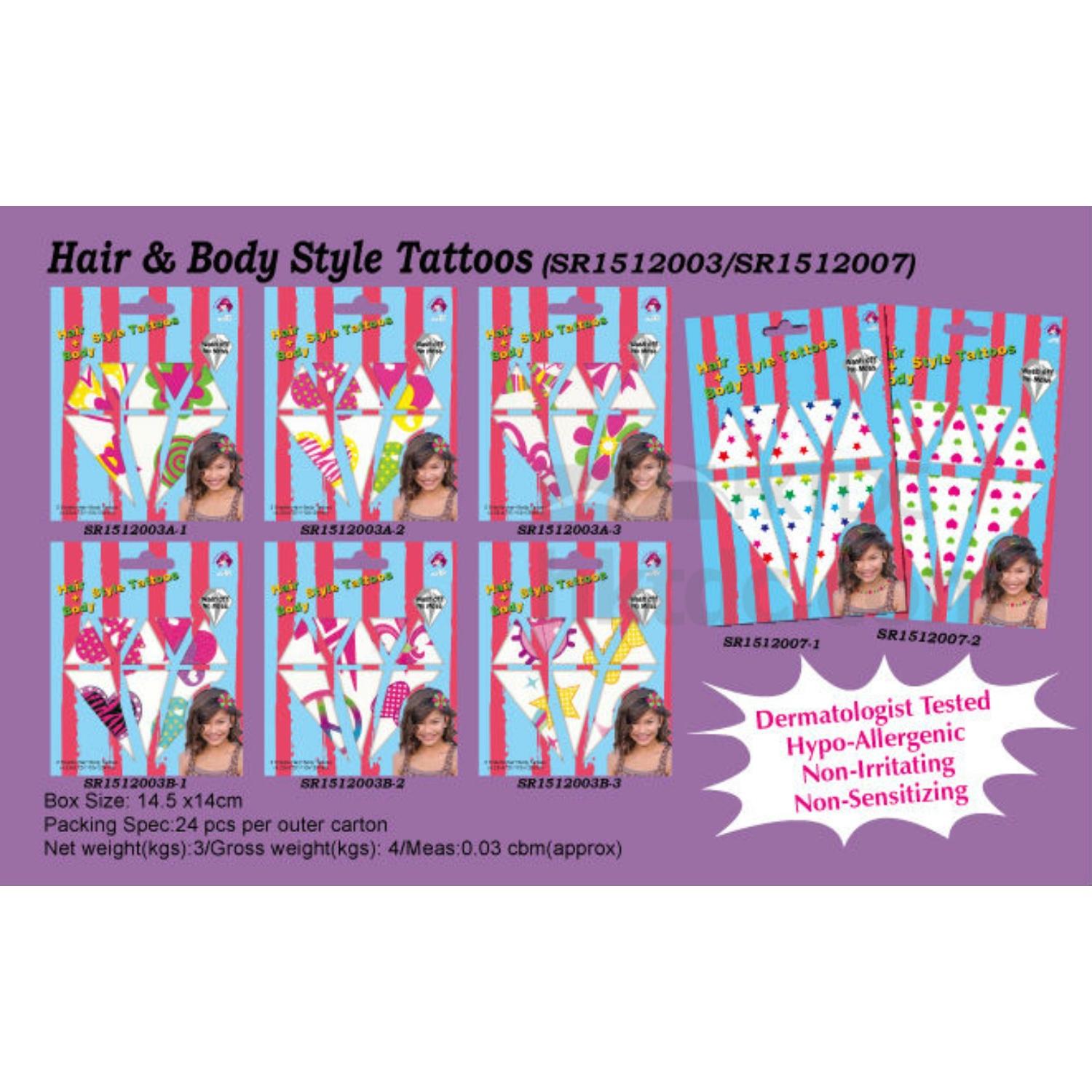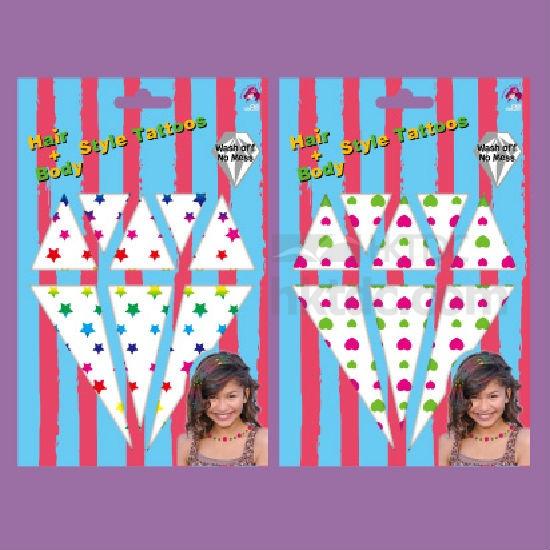 Highlighted here is a set of tattoos for hair and body use. The tattoos come in different styles and are easy to apply and remove. These tattoos are hypoallergenic, non-irritating, non-sensitizing and safe to the skin.
