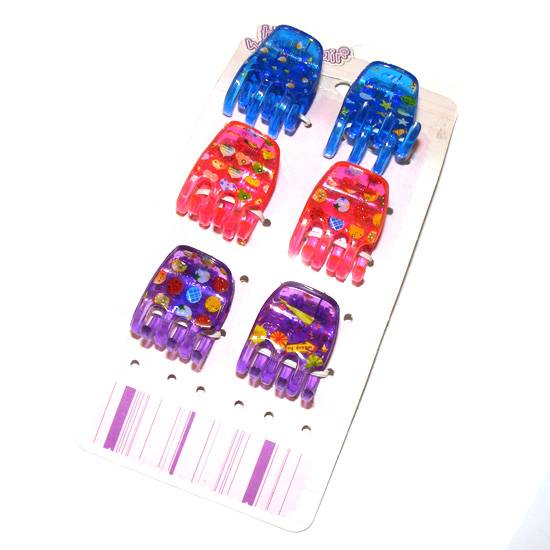 This is a set of six colourful plastic hair claws for girls and young ladies. There are two blue, two pink and two purple clips which are printed with cute patterns such as fish and heart.