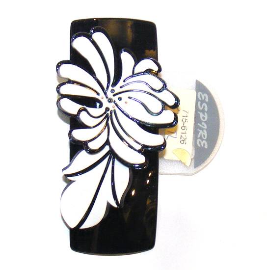 The featuring item is a hair clip for ladies and women. It has a white flower rimmed black as the main ornament on the black ground, which shows a classy and refined style.