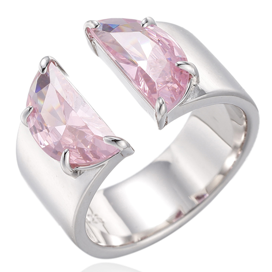 Half Moon Shape Diamond Pink Cubic Zircon Rhodium Silver Open Ring