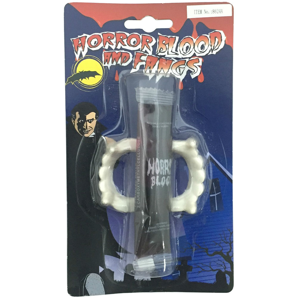 Dress up for Halloween with this set of fake blood and vampire teeth. The vampire teeth offer a flexible fit and the fake blood can be used to add a scary touch to your Halloween decor. This Halloween set is a fun and simple accessory for Halloween costumes and is perfect for completing a vampire look.