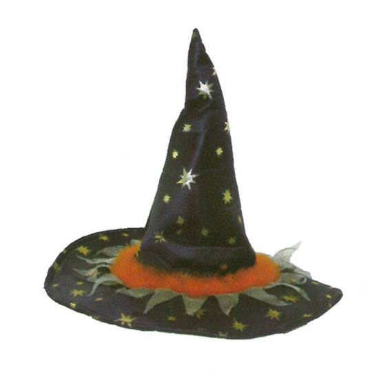 This is a witch hat in black with golden star patterns. It is finely adorned with a sun-like embellishment for added charm. That hat is a great head accessory for Halloween parties.
