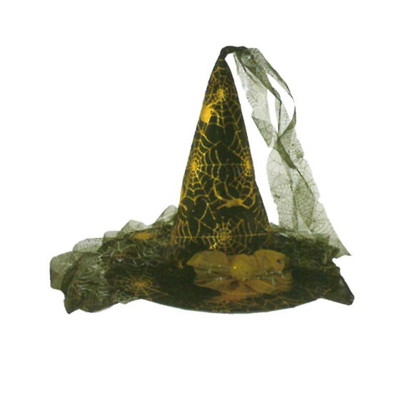 This witch hat appeals to people with its deluxe and sophisticated appearance. It comes in black with golden spider web patterns. The hat is also adorned with beautiful decorations for a touch of charm.