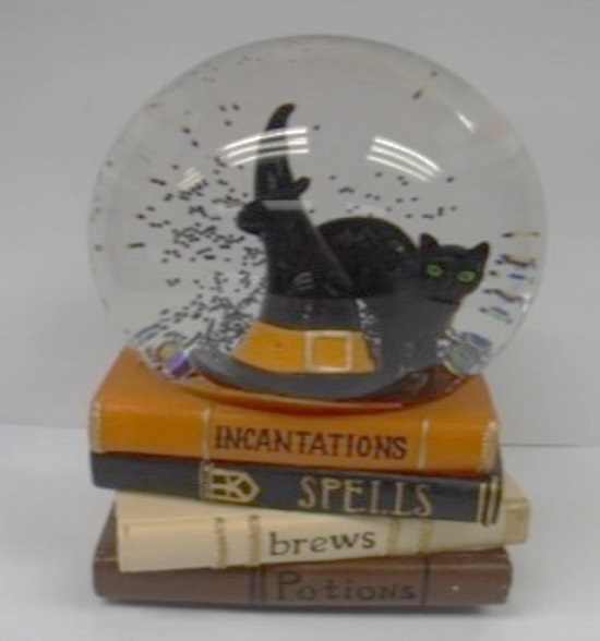 Polyresin/Glass black cat with witch hat waterglobe with wind-up music