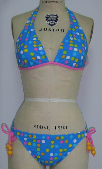 Textured assorted vivid dot patterns all around, this halter style bikini is a perfect beachwear for young ladies for sure. The tie-ups over the brief comes with several round beads to further make it an adorable bikini.