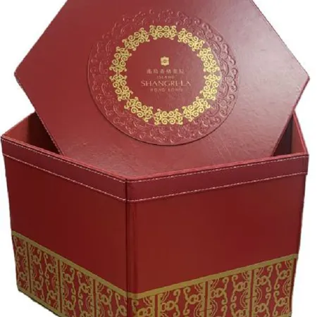 This red gold gift box features a hexagonal lid with gold patterns and intricate patterns surrounding the box body. It is elegant and luxurious, seemingly containing a full box of exquisite items and respect, fully embodying the Chinese style of gift presentation.