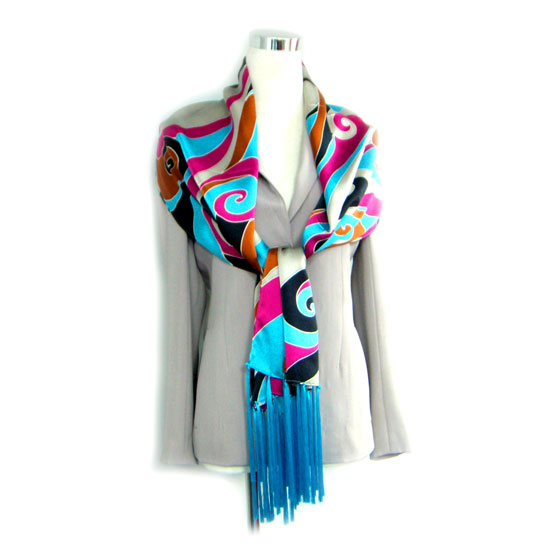 Spice up your look with this vibrant, colorful satin silk Batik shawl with tassels. Smooth curvy hand drawn patterns in luscious hues set this shawl apart from others. This playful and remarkable shawl highlights your energetic, youthful character.