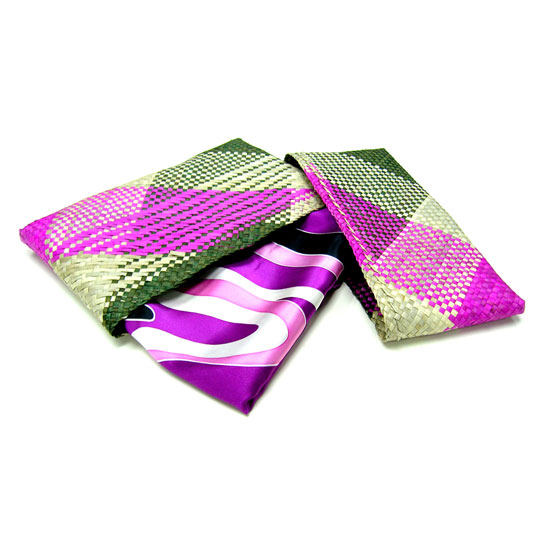 This extravagant silk Batik shawl enhances your femininity and glamour. The delightful gift set comes with a matching hand woven pandanus pouch. This well crafted set captures customers' attention instantaneously.
