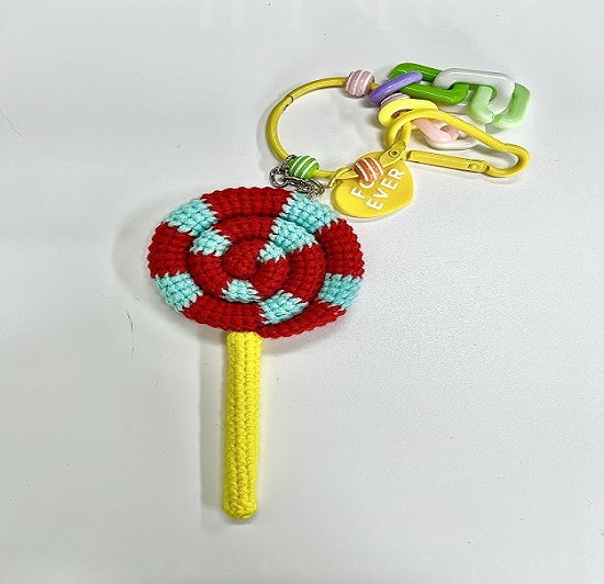 -The main body is a crochet rainbow lollipop in red, blue, and yellow colors, which is cute and cartoonish, very playful