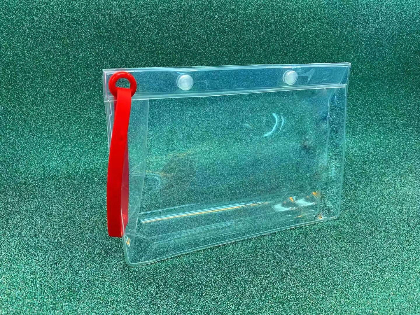 The highlighted storage pouch has a clear rectangular compartment with top buttoned closure. It is attached with a red strap at the corner and is convenient to carry around your wrist. This storage pouch offers easy access to stored items and can provide good protection to items inside.