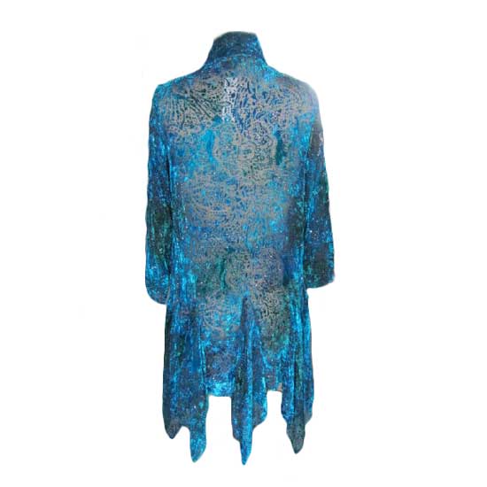 This is a long coat crafted of shiny velvet fabric that is made from 70% rayon and 30% nylon. It features a bright blue background with hand-printed patterns. This luxurious coat is an ideal addition to your wardrobe.