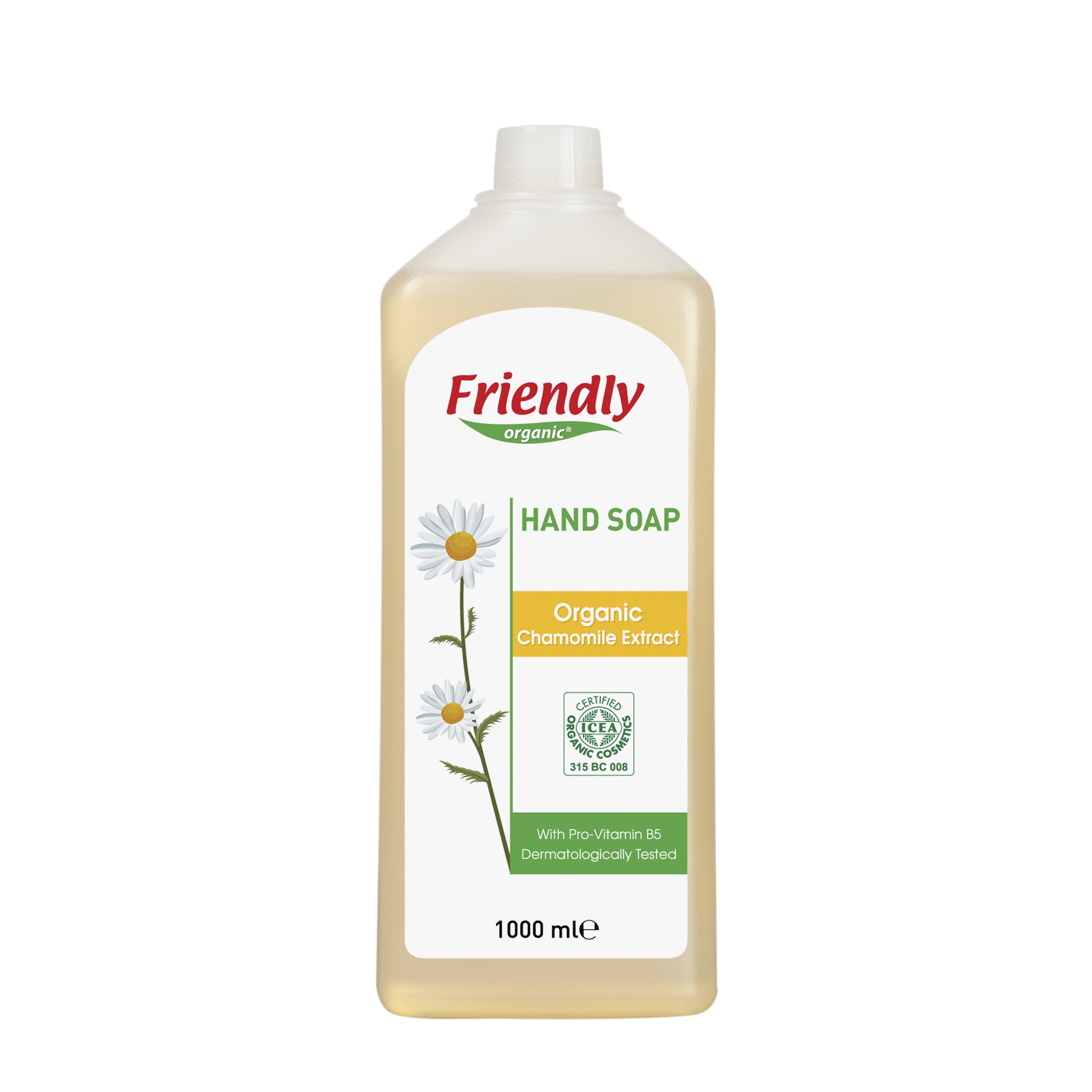 Friendly Organic Hand Soap cleans your hands with pure plant-based ingredients. Organic chamomile extract is combined with Pro-Vitamin B5 to nourish the skin, leaving hands gently cleaned and smelling fresh. Gentle enough for frequent hand washing- perfect for the whole family.