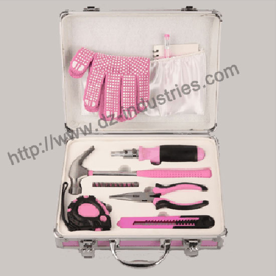 This pink lady tool set flaunts a lovely pinkish hue. The tool set comes with a pair of work gloves, pliers, a measuring tape, a hammer and a cutter. This featured hand tool set is ideal for home use.