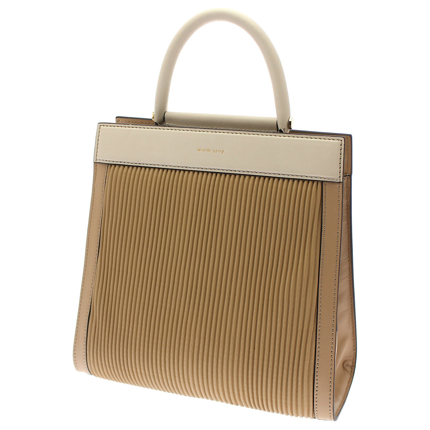 Featured here is a handbag made of cow leather and sheep skin. It has a spacious compartment for storage and is embellished with stripes on the exterior. With a handle on top, this handbag is comfortable and convenient to carry.