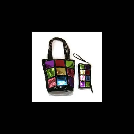 • This handbag and purse are decorated with colourful square patterns that have shiny surfaces
