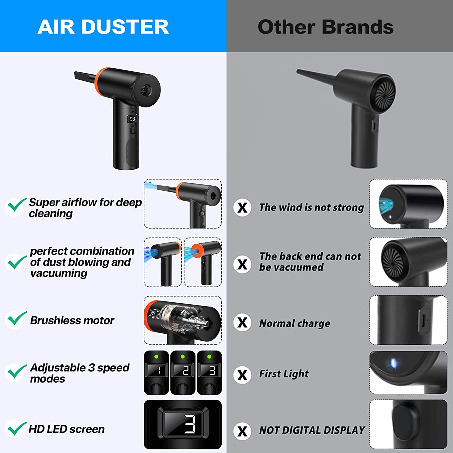 Compressed air duster【Wind Powerful with 3 Speed Modes】: air duster has 3 speed wind speeds --- Long press switch for 3 seconds can switch the device on & off. Short press switch can switch to three wind speeds for different equipment cleaning, so that dust has nowhere to stay.Cleaning will become a enjoy.