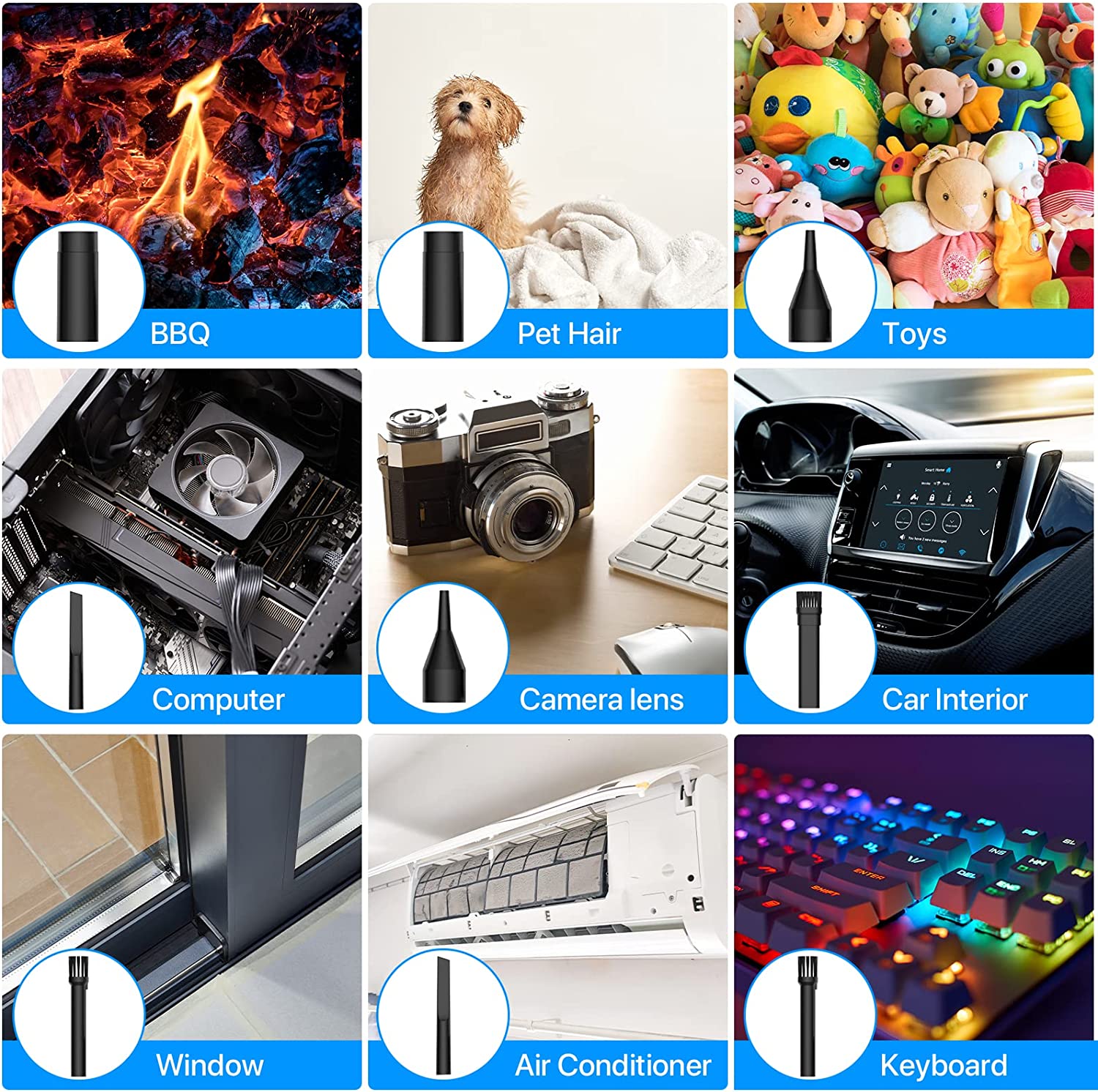 Compressed air duster【Multi-use & Easy to Carry】: You can have 5 nozzles, 2 cleaning brushes & 1 tube for multi-scene cleaning. Multi-use to lots of places.Suitable for dust removal of computer cases, keyboards, cars, fans, lily windows, etc.