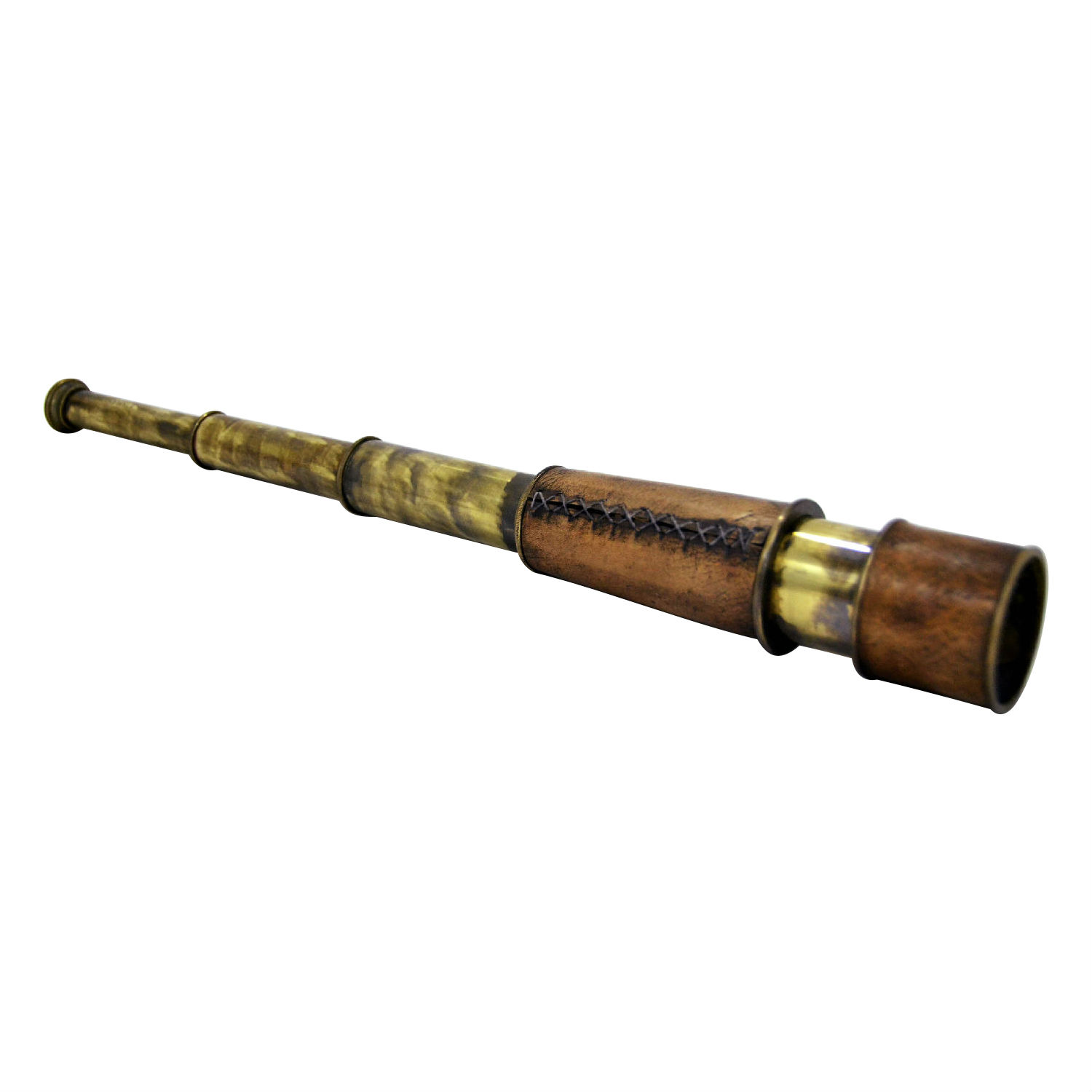 This is a well-made brass handheld telescope which makes a wonderful addition to nautical items collection. The item comes with two different textures, while criss cross lacing details are made for added appeal. Rounded off with antique finish all over, this device looks classy and nostalgic.