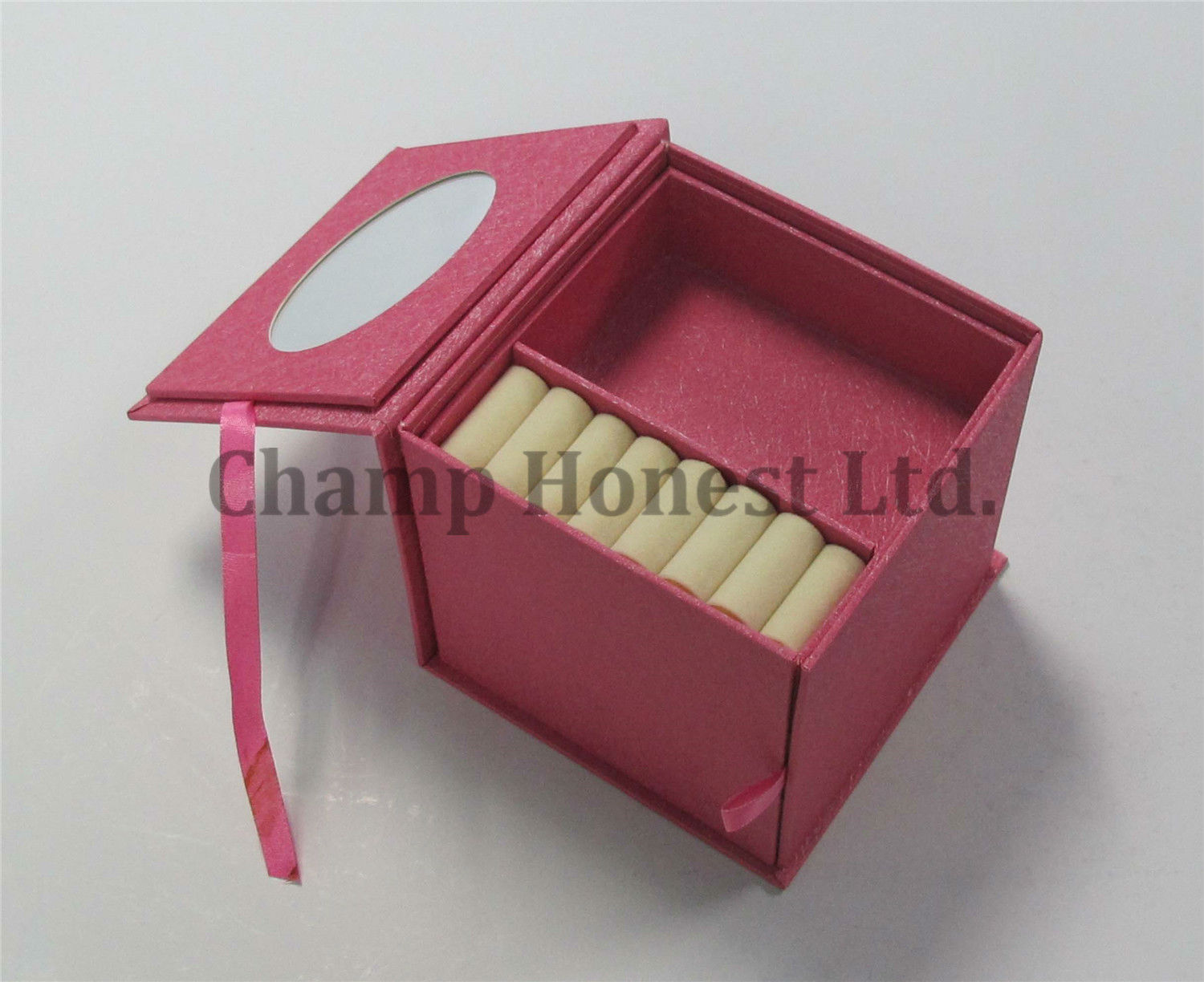 Featured here is a luxurious handmade paper box for packaging use. It comes in a rectangular shape and has a storage compartment and a ring holder inside. This packaging box has a mirror at the back of the lid and is ideal for using as a jewelry box.