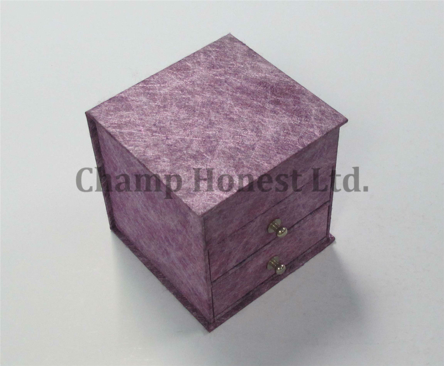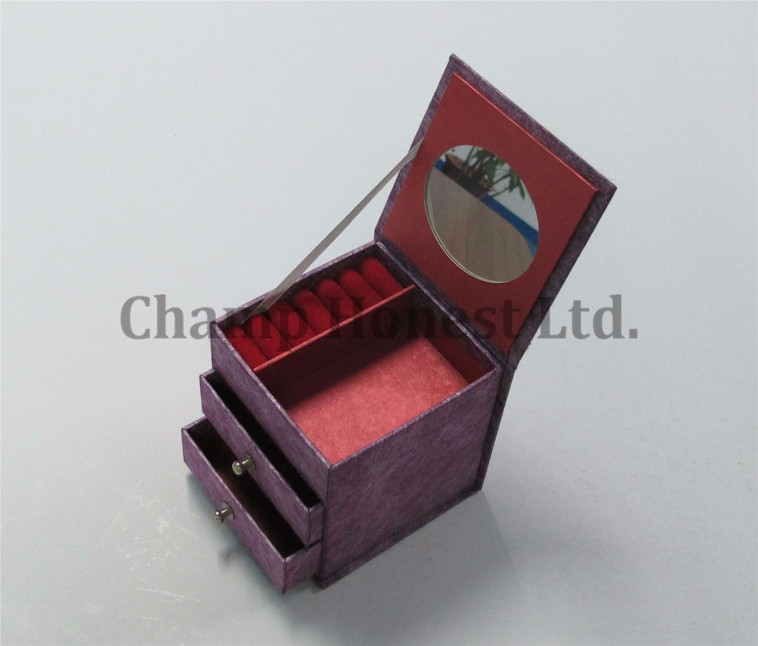 The pictured handmade box is made of paper and come in a rectangular design. It has a storage compartment with a ring holder and has two drawers below. This box has a round mirror at the back of the lid and is excellent for jewelry storage use.