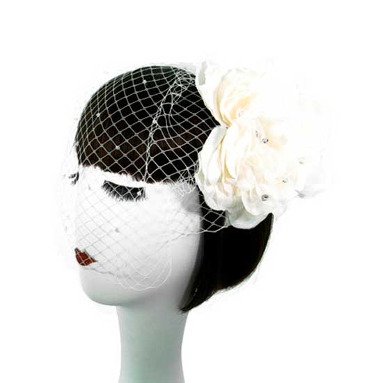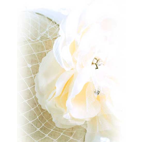 This dramatic headdress features a beautiful flower nestled at the side of the ear. The French veiling at the front is sparkled with clear beads. This elegant handmade bridal headdress is a gorgeous alternative to a classic veil.