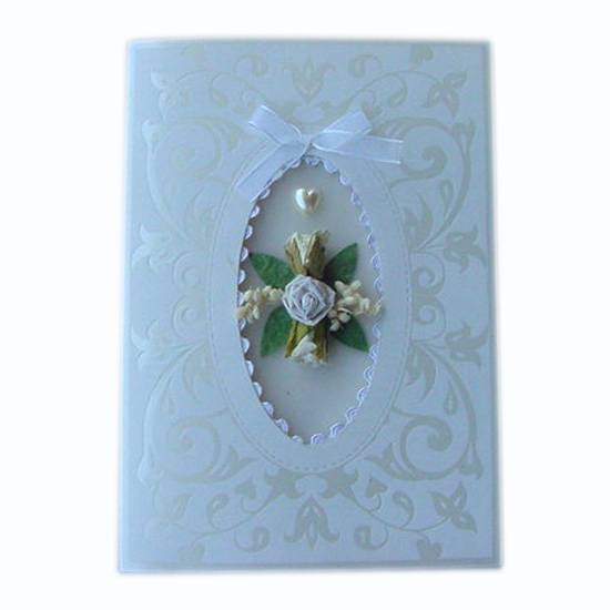 This is a handmade card with a beautifully illustrated cover. The artificial flowers are framed with lace edges, a ribbon and embossed patterns for added elegant glamor. This greeting card makes a wonderful item for delivering warm messages among friends.