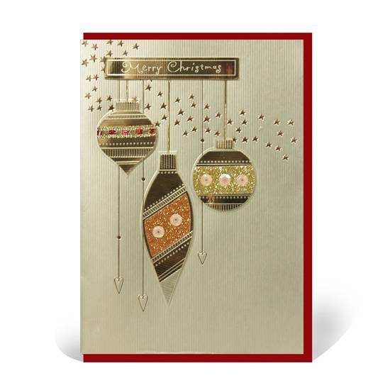 The Christmas card flaunts a grand design with a golden color. The embossed Christmas decoration boasts an enhanced festive flair. This card is handmade with excellent craftsmanship to give a heart-warming greeting to every receiver.