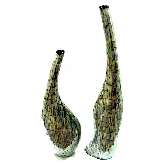 The handmade flower vases boast a curled silhouette. They are fully encrusted with mother-of-pearl pieces for enchanting shine. These flower vases are the welcome additions to your home decor.