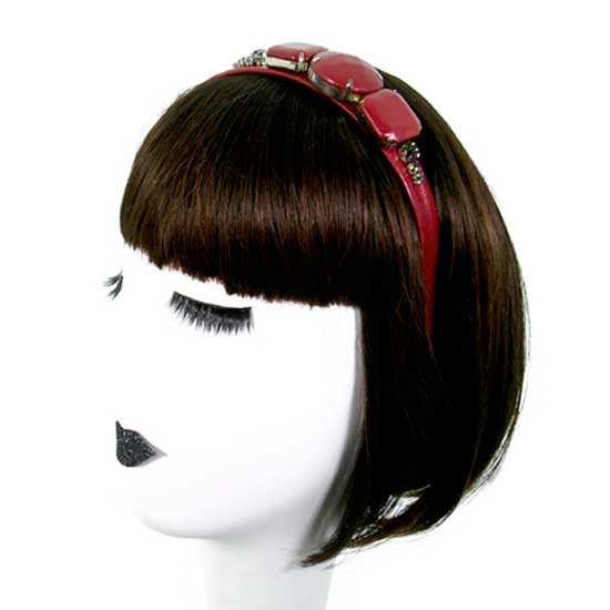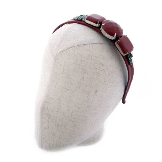 Nothing is cooler than this leather headband. The large gems set in metal claws are wrapped in fine lamb-leather. The rhinestones in contrasting colors at the side of the band add shimmer to the headband.