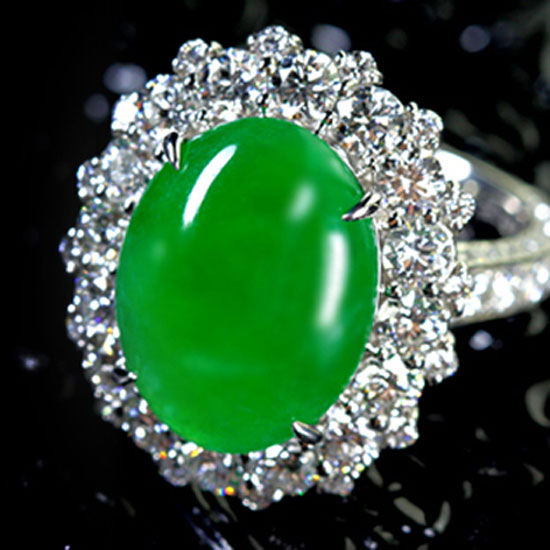 This handmade jadeite ring is truly fabulous with its vivid green color. We also design the mount for the jadeite to look the best. The surrounding diamonds further introduce a luxurious flair to the ring.
