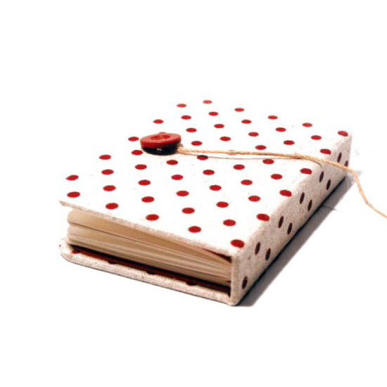 This is a handmade notebook boasting a dainty and outstanding design. It features a robust hardcover with red dots for a touch of elegance. The red button with a rope adds an exquisite sense to this design.
