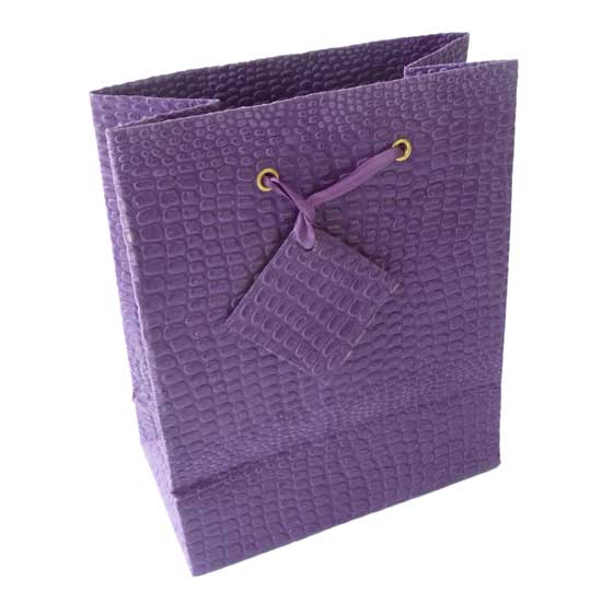 Showcased is a handmade paper bag finished with an all-over crocodile texture. The noble-design bag is made of 100% recycled handmade paper. Carry shopped items with this exquisite green bag.